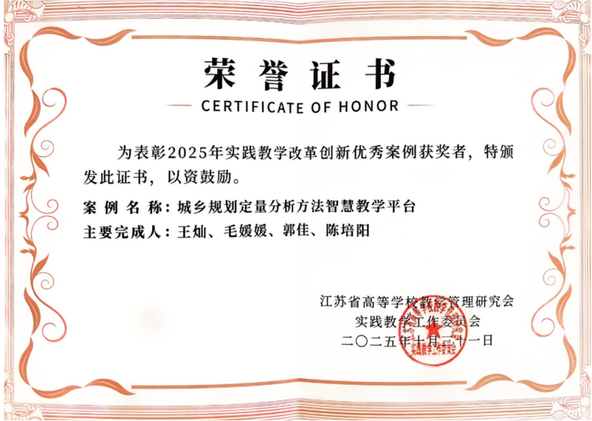 同时,由我校金螳螂建筑学院王灿、毛媛媛、郭佳、陈培阳等教师共同完成的“城乡规划定量分析方法智慧教学平台”项目,成功入选2025年度江苏省“实践教学改革创新优秀案例”。该案例聚焦数智化实验教学资源建设,通过构建智慧教学平台,有效提升了城乡规划专业学生在定量分析方面的实践能力与创新能力,是学校推动信息技术与教育教学深度融合的又一典范之作。