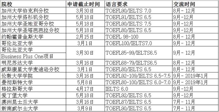 学校不同,报名截止时间不同,请详细查看,提前准备申请材料。强烈建议申请2018年秋季学期交流的同学尽早在寒假期间准备好托福或雅思成绩。