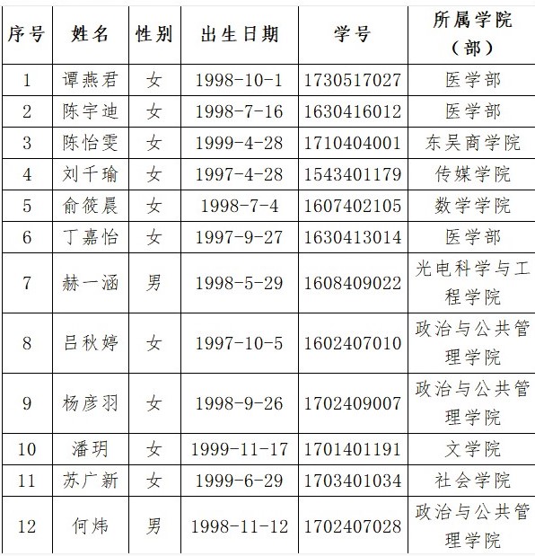 根据国家留学基金委【2018】7967号文件通知,经本人申请,学院(部)、教务部及国际合作交流处审核,我校拟推荐医学部学生谭燕君等12人(详见推荐名单)参加2019年加拿大阿尔伯塔大学本科生实习奖学金项目的选拔。